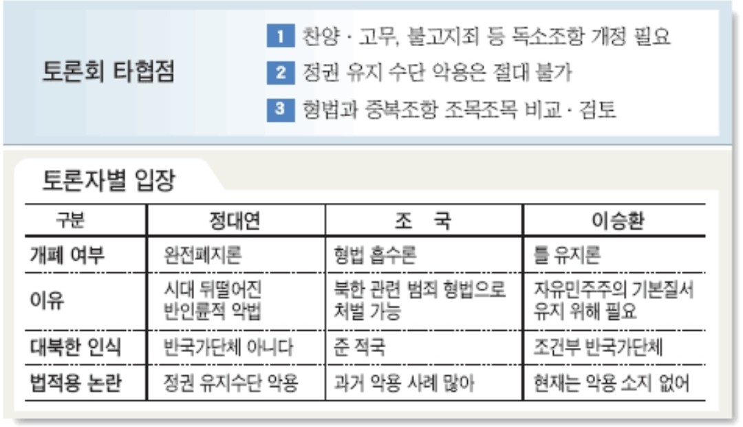 유지 반대 측: 북한 위협 등 특수 상황 → 국가안보를 위해 반드시 필요하다.