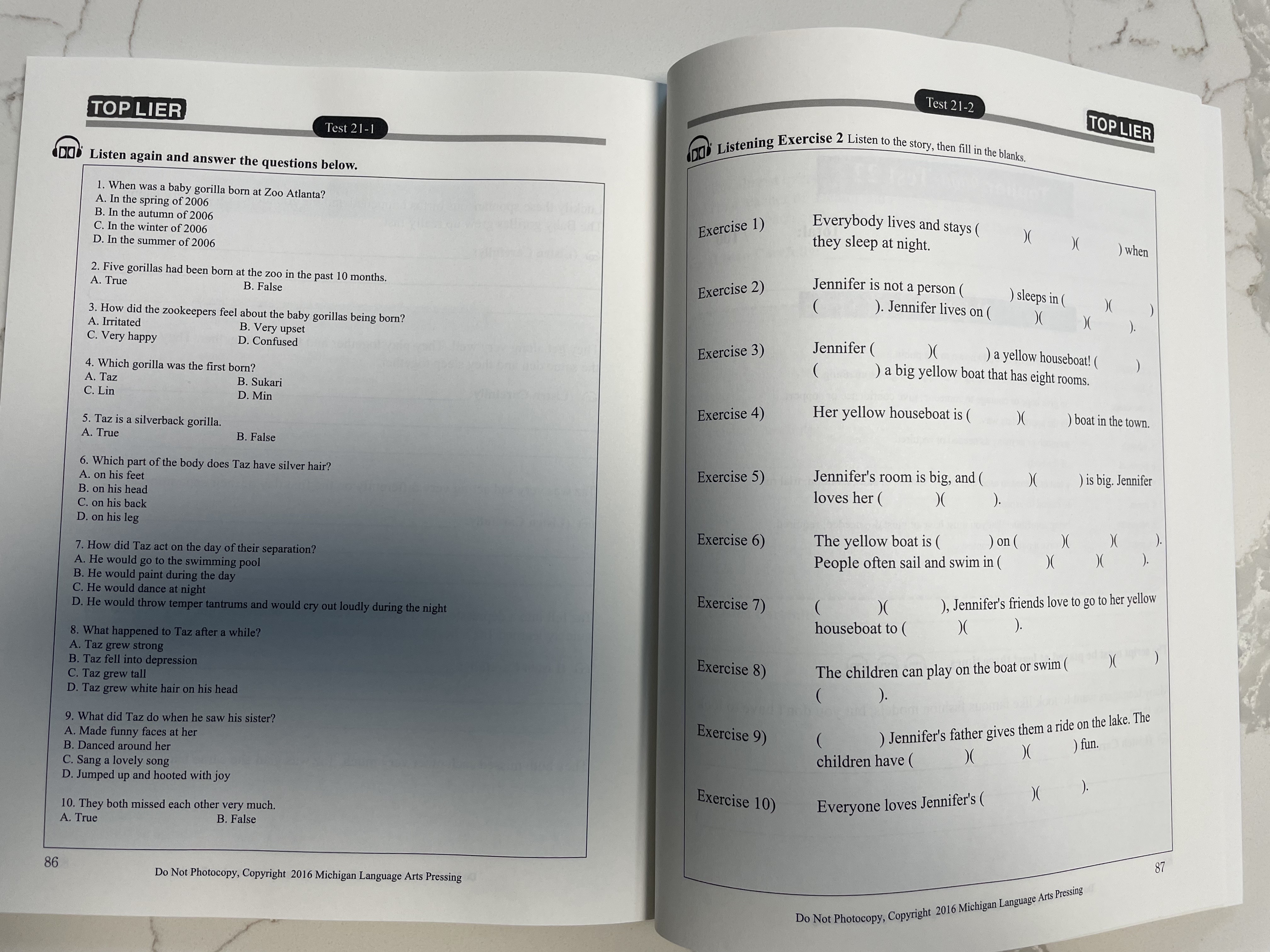 Story를 듣고 문제를 푸는 형식과 문장을 듣고 빈칸을 채우는 형식이 제시됩니다.