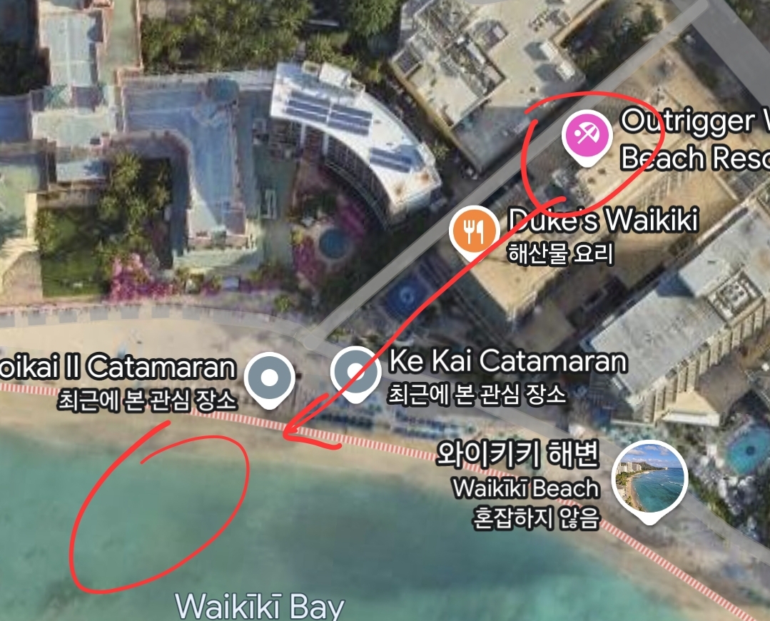 와이키키세일링닷컴의 요트를 타는 위치는 듀크하나모쿠 동상에서 해변으로 쭉 나오시면 둑 같이 쌓아올린 모래해초를 굳힌 구조물이 있습니다. 그곳바로 옆 동그라미 표시된곳이 바로 선착장 입니다.