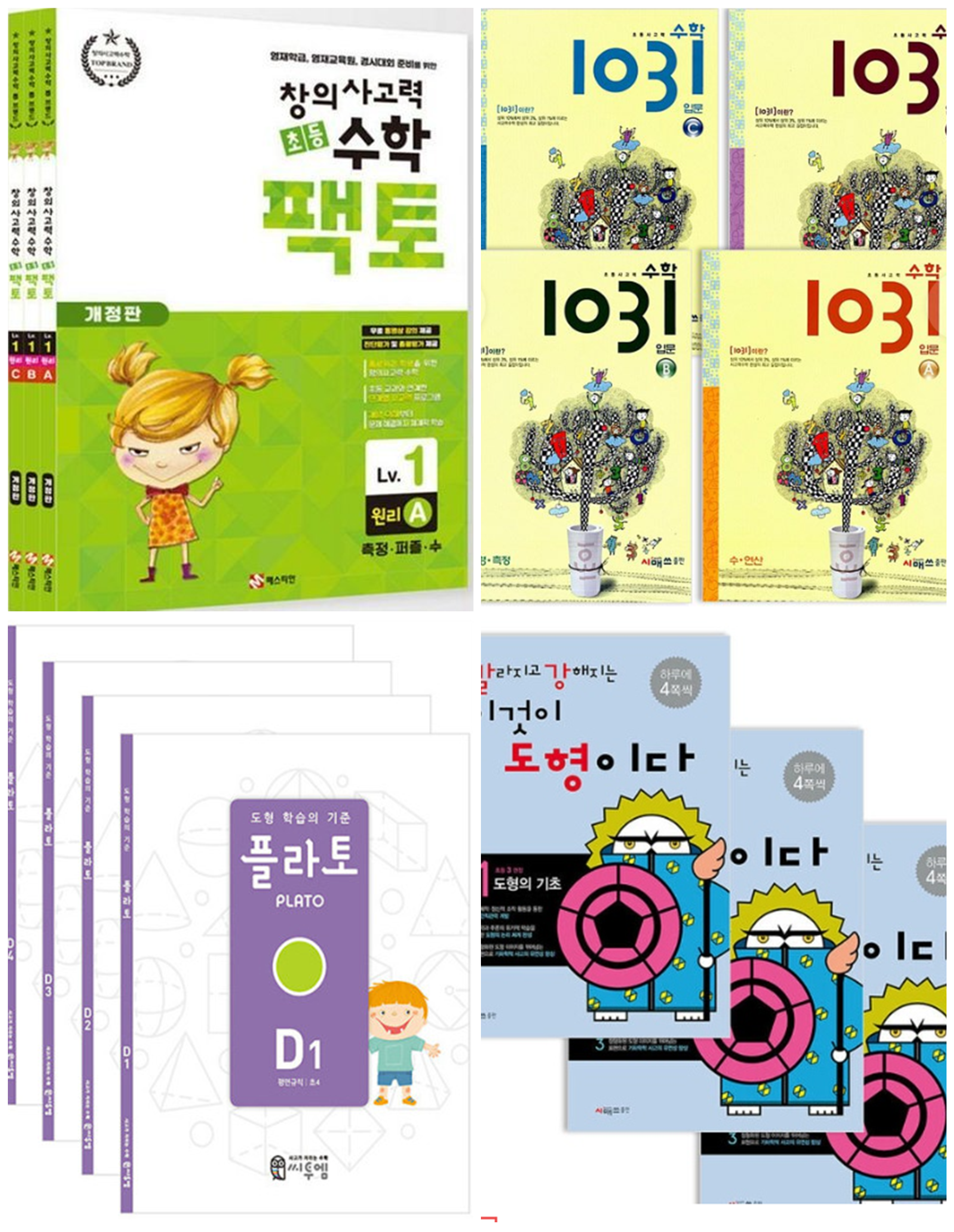 3) 도형 문제집: 빨강 도형, 플라토를 대부분 활용 하시고 저 역시도 이 두 시리즈물에서 많은 도움을 받았습니다. 도형 문제 중 취약한 부분에 필요한 문제집을 골라 활용 하신다면 많은 도움을 받으실 수 있습니다.