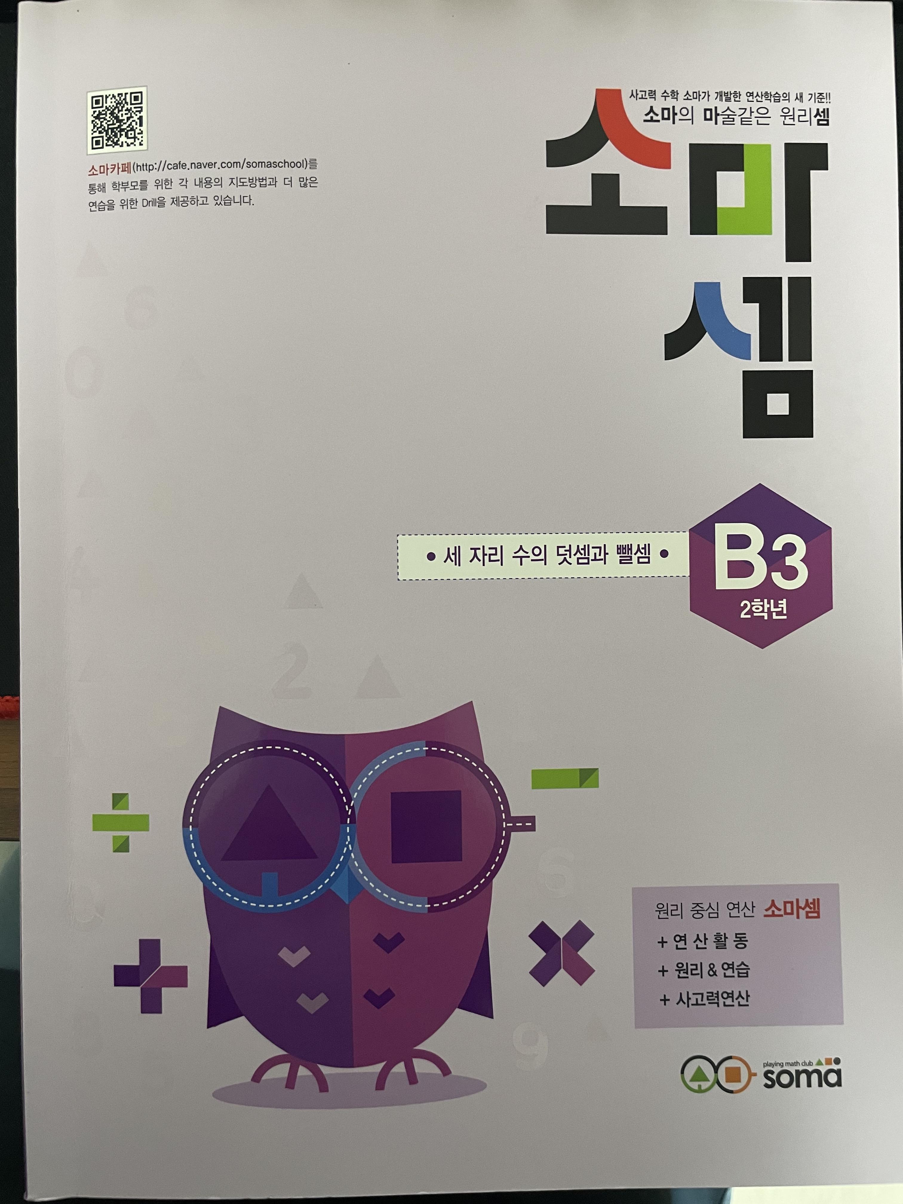 소마셈은 많이 대중적인 문제집 중에 하나입니다. 소마 학원으로 인해 더욱더 유명해지고 선호도가 높기도한 문제집 입니다. 소마셈은 영역별로 분리 구성되어 있습니다. 소마셈의 장점은 컬러풀하고 부담스럽지 않게 보이며, 무엇보다 원리를 깨우친 다음 연산을 풀 수 있도록 되어 있다는 점입니다. 단순 연산 반복 학습이 아닌 사고력 적인 연산 학습 적인 문제도 함께 제공되어 아이들에게 많은 도움이 된다고 생각합니다. 벌레 먹은 덧셈 , 문제장 같은 문제들도 제공 되며 책의 마무리 부분에는 반복으로 문제를 풀고 복습 할 수 있는 문제들도 제공이 됩니다. 가령, 교과 문제집을 풀다가 세자리수 덧셈이 조금 부족하다는 생각이 들때는 세자리수 덧셈 파트 부분의 책만 구입해서 풀 수 있다는 장점도 있습니다.