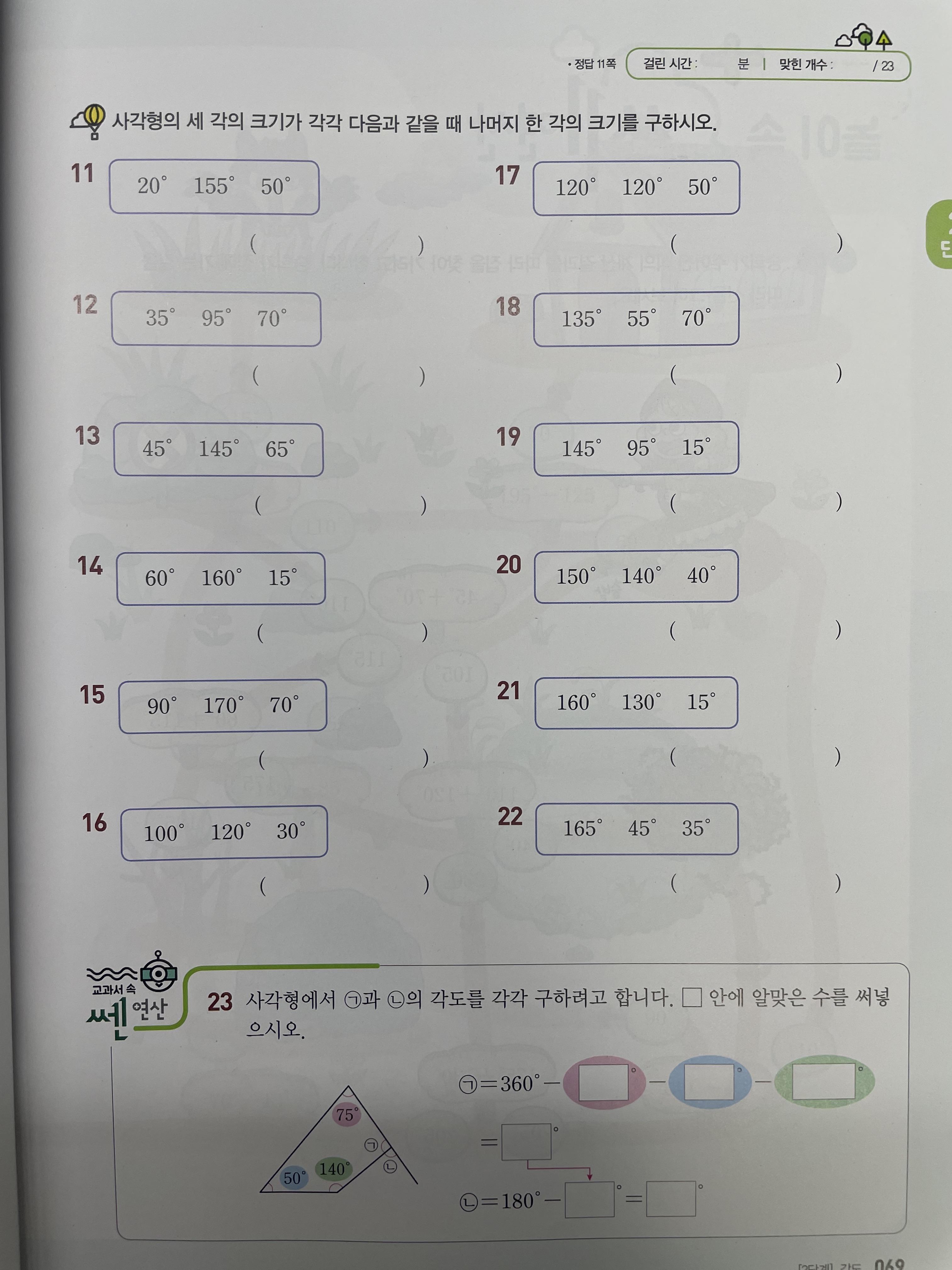 쎈연산은 주로 초등학생 고학년 아이들이 많이 사용하는 연산문제집 입니다. 쎈 시리즈는 초등생 부터 고등생까지 많은 대중에게 선호도가 높은 문제집이기도 합니다. 쎈연산의 특징은 기존 연산 문제집과는 달리 교과 바탕이라는 것입니다. 보통의 연산 문제집은 4칙 연산을 기본으로 진행되지만 쎈연산의 경우는 교과서에 나오는 연산과 관련된 문제들을 연습하는 문제집이라고 볼 수 있습니다. 가령, 길이재기, 들이와 무게 같은 단원에서도 길이 덧셈, 무게 덧셈 같은 문제들이 단원별로 구성되어 제시 됩니다. 학년,학기 별로 구분되어 있으며 학원의 문제집에는 1단원,2단원 등으로 학교 교과서의 단원과 동일하게 제공됩니다.