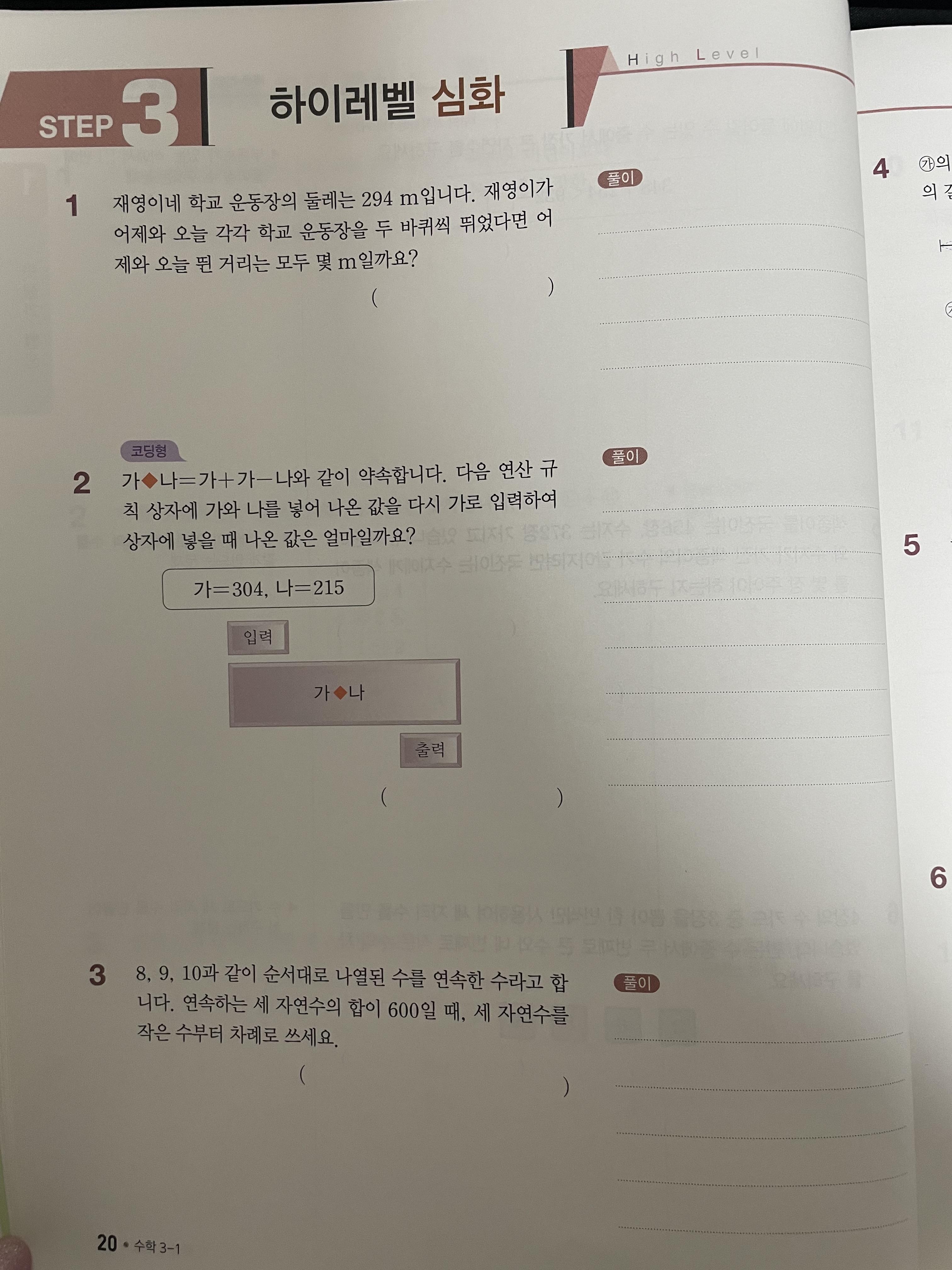 EP2에서는 하에레벨 탐구라는 소주제로 유형 문제들을 제공합니다. 대표 유형문제를 통해 유형을 익히고 체크 문제로 2-3제를 복습하게 됩니다. 그 후 하이레벨 탐구 플러스라는 이름으로 유형 문제가 2바닥 정도 제공 됩니다. STEP3에서는 하이레벨 심화문제들이 제공 됩니다. 이 단계의 모든 문제들은 답만 쓰는 것이 아니라 옆 칸에 풀이 모두 적어야 합니다. 브레인스토밍이라는 단계에서는 경시대회 본선 진출 문제들도 제공됩니다. 생각이 많이 필요한 문제들이 모두 제시 되며 이 문제들 또한 풀이과정을 모두 적어내야 합니다.