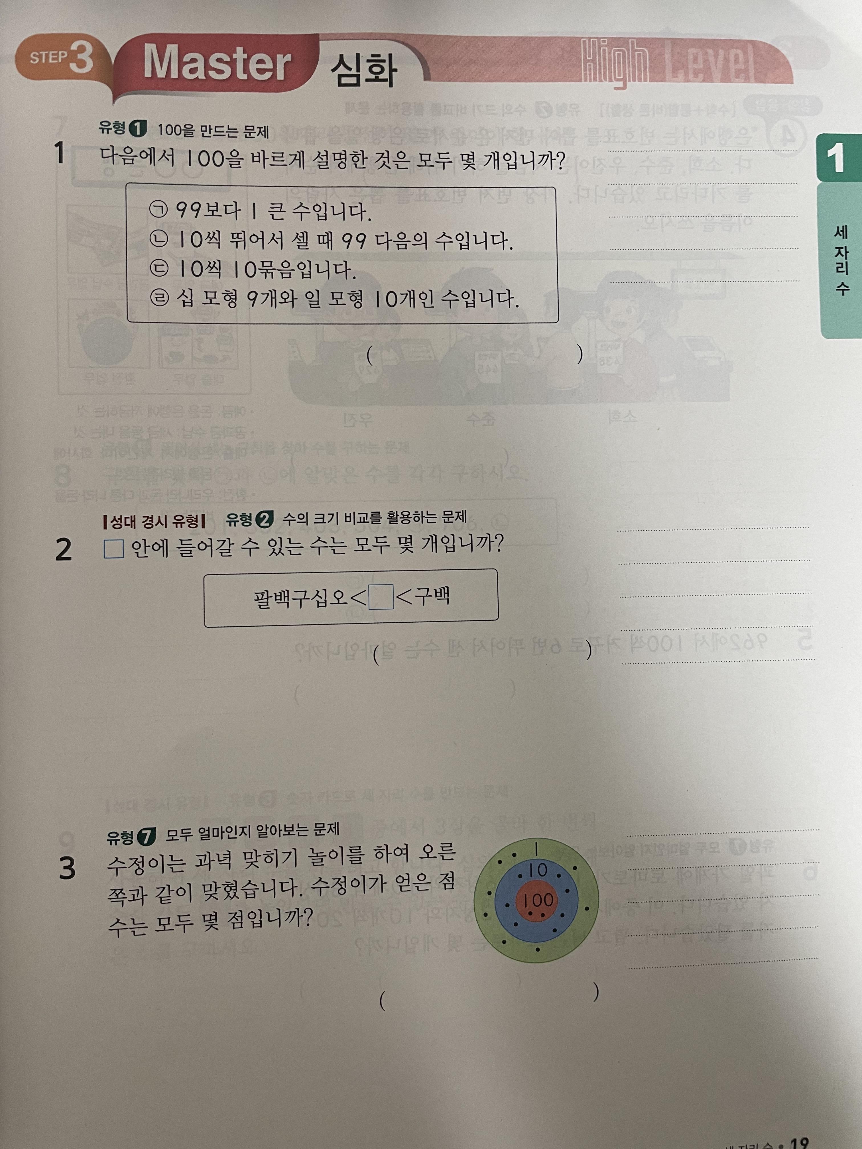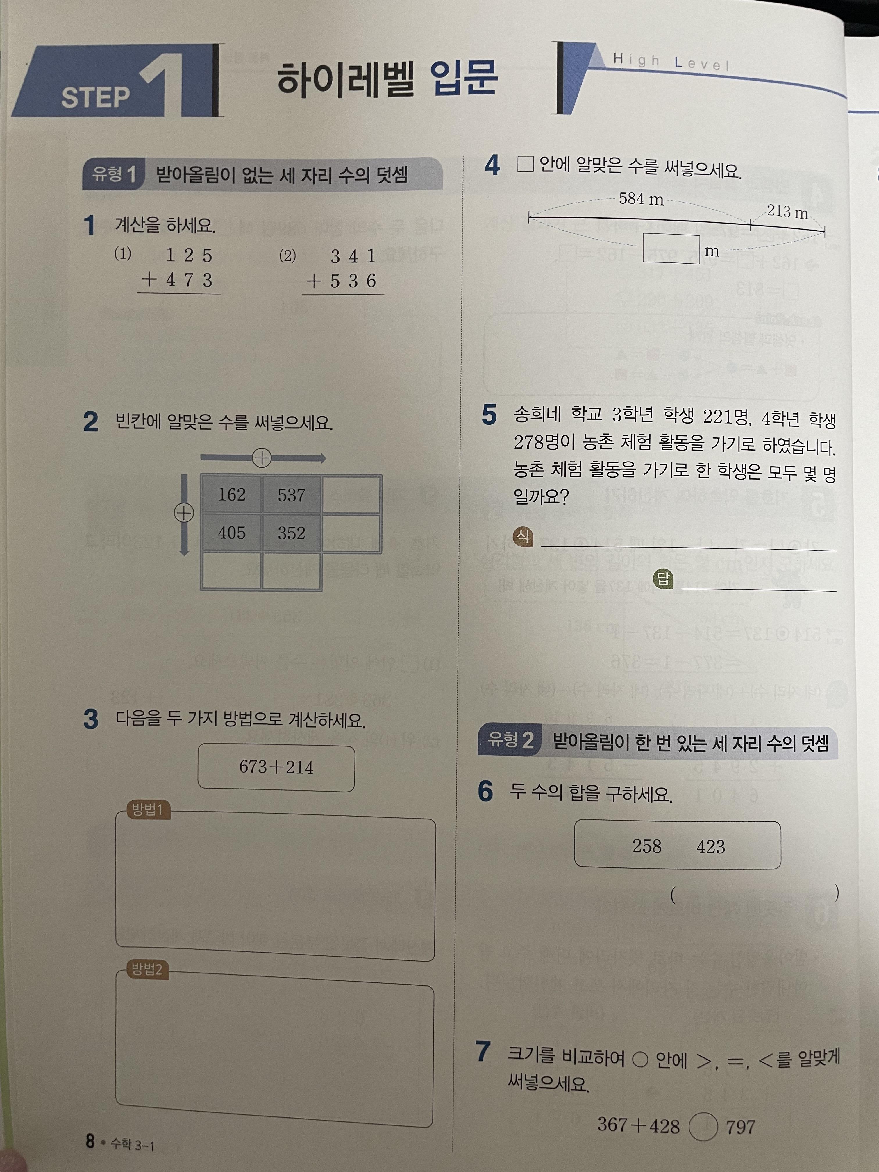 천재교육에서 나온 최고수준 수학은 단원마다 STEP1,2,3,4로 단계가 나누어져 문제가 제공됩니다. STEP1에서는 가장 기초개념을 다루며, STEP2에서는 유형 문제들을 다루게 됩니다. 예제 문제로 유형을 1번 경험한 후 유사 유형 문제를 2-3문제 푸는 형식으로 구성되어 있습니다. STEP3에서는 심화 문제가 제시 되는데 그 문제들 중에서는 성대 경시, 해법경시 유형 문제들도 많이 제공 됩니다. STEP4는 최고수준의 문제가 제공됩니다. 이 단계에서도 경시 문제들이 많이 제공됩니다.