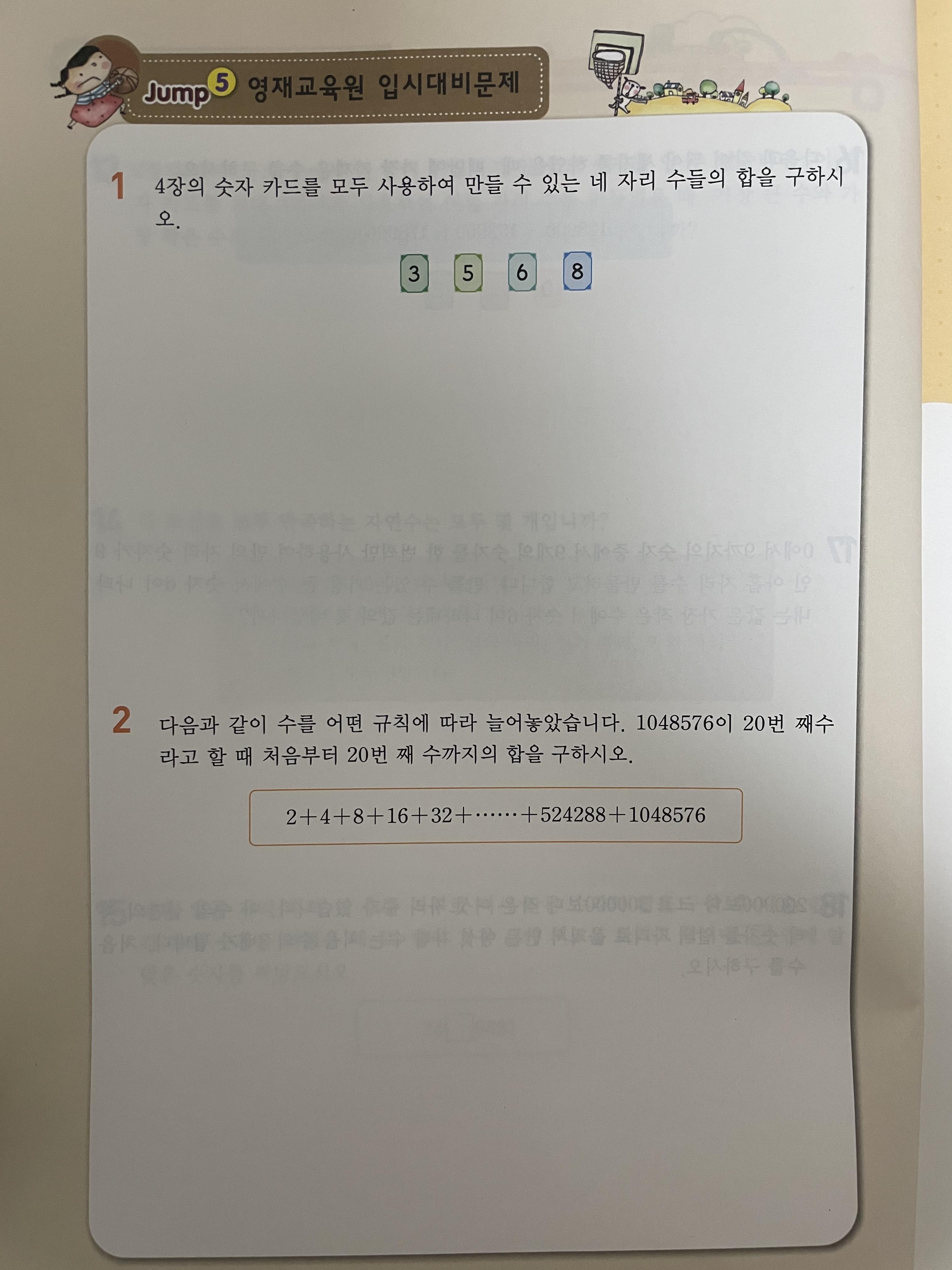 황소 학원으로 인해 더욱더 유명세를 달리고 있는 에듀왕 시리즈의 심화서는 점프왕수학입니다. 점프왕수학과 최상위 수학을 푼 후 황소학원 레테를 치면 통과한다는 말이 많을 정도로 사람들에게 인정받고 있는 심화서 입니다. 점프왕 문제집은 JUMP1 핵심알기, JUMP2 핵심 응용하기, JUMP3 왕문제, JUMP4 왕중왕문제 JUMP5 영재교육원 입시대비문제로 단계가 나뉩니다. 이 문제집은 JUMP1이 모두 제시 된 후 JUMP2가 제시되는 것이 아니라 JUMP1의 한 개념을 알고 문제를 푼후 바로 옆바바닥에 그 개념과 관련된 유형문제가 JUMP2로 제시됩니다. 그 다음장에서는 다시 JUMP1 다른 개념이 제시된 후 그 옆바닥에 JUMP2에서 유형 문제가 제공됩니다. JUMP1과 2가 번갈아가면서 제시되다가 JUMP3으로 넘어갑니다. 이 단계에서는 심화문제를 20문제 가까이 풀게 됩니다. 그 후 JUMP4단계에서는 조금 더 깊은 심화 문제를 20문제 정도 풀게 됩니다. 문제수가 상당히 많은 편입니다. 이렇게 많은 문제를 풀고 나면 JUMP5에서 영재교육원 입시대비 문제 2문제 정도를 풀게 됩니다.