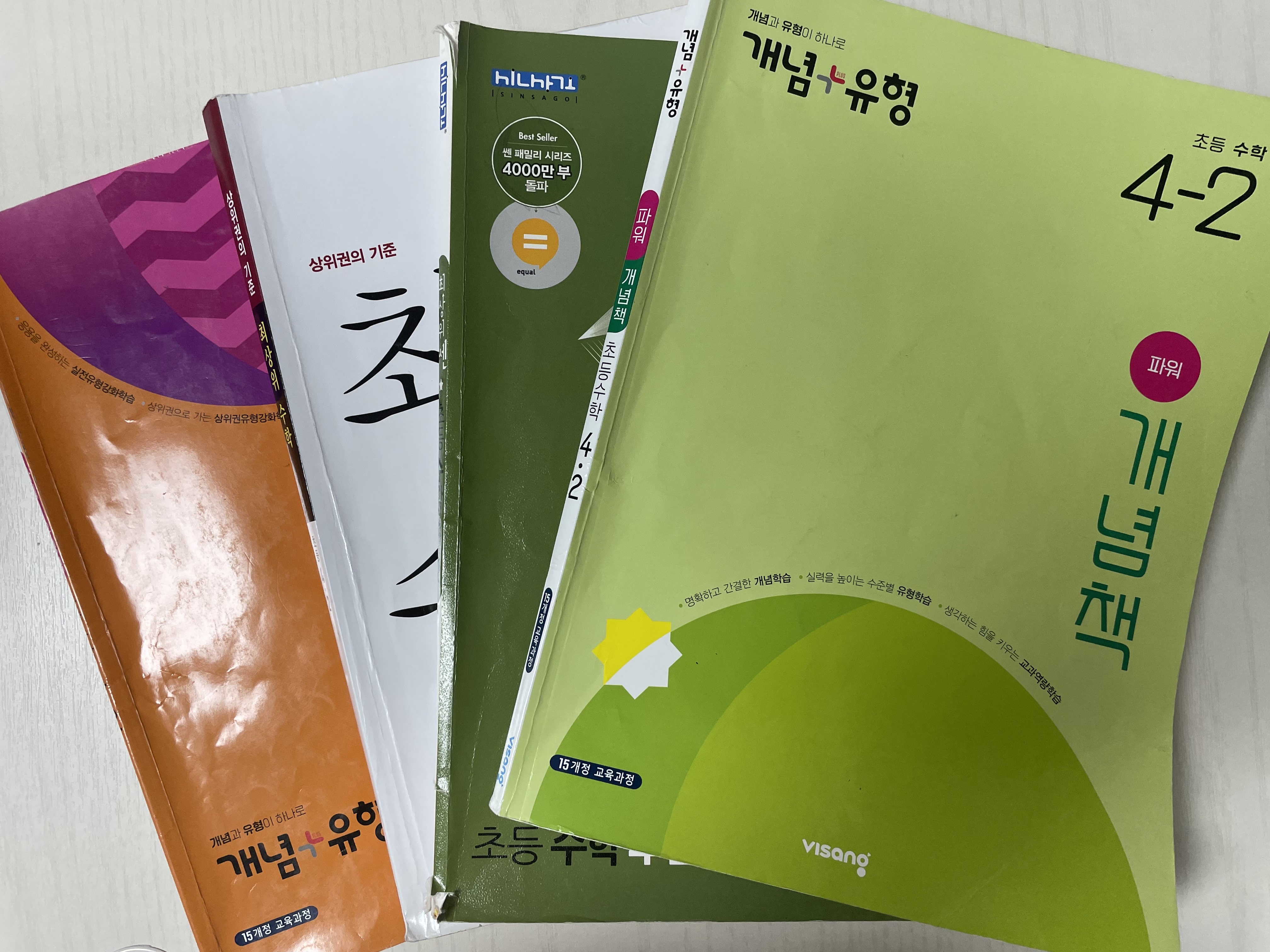 개념, 유형서를 묶어서 비상에서 출판된 개념+유형 파워, 심화서는 최상위쎈, 최상위 수학으로 진행했어요.